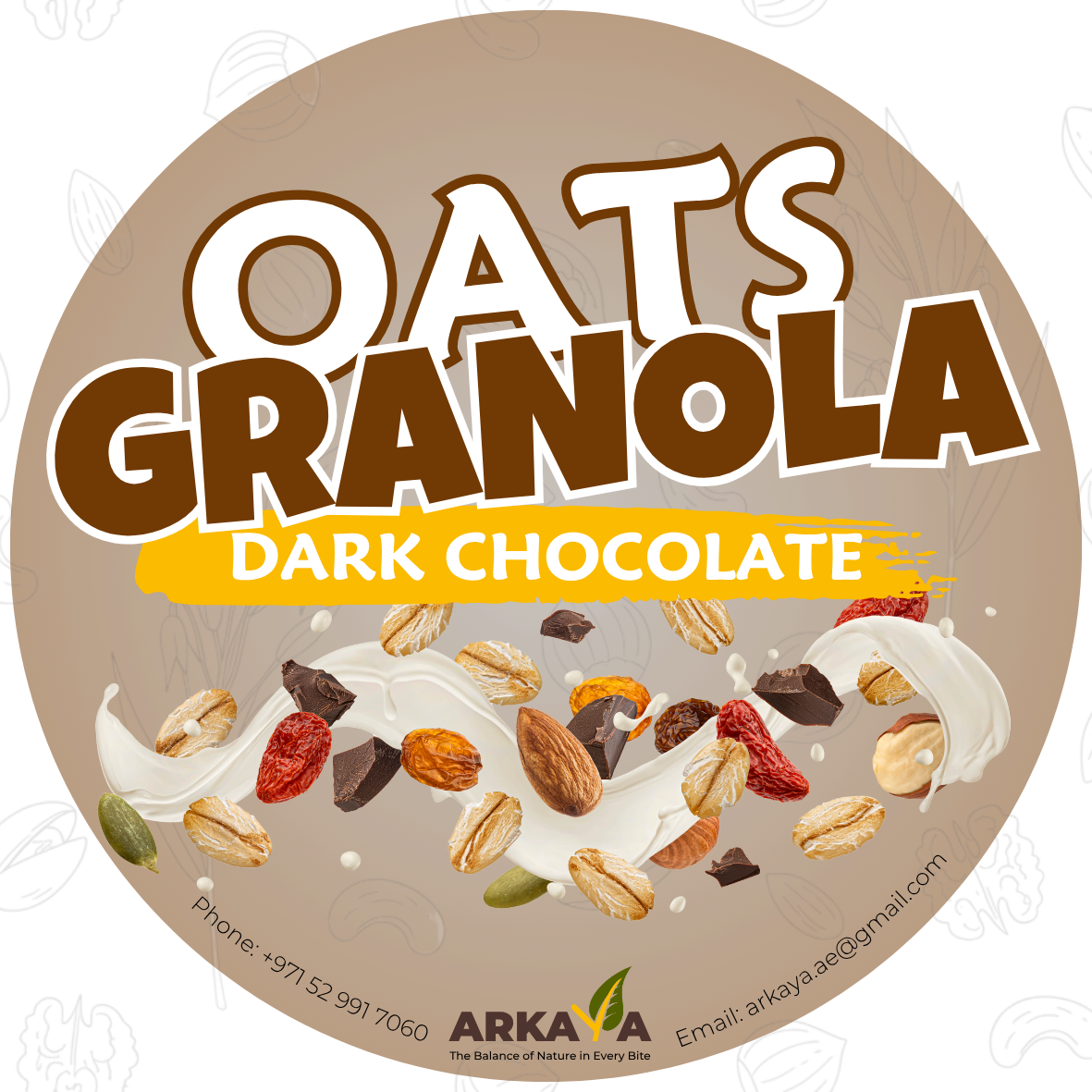 شوفان محمص، مكسرات متنوعة (لوز، عين جمل، بندق، فستق، كاجو)، عسل طبيعي، زيت جوز الهند، مسحوق الكاكاو الطبيعي، قطع الشوكولاتة الداكنة، ولمسة خفيفة من القرفة.