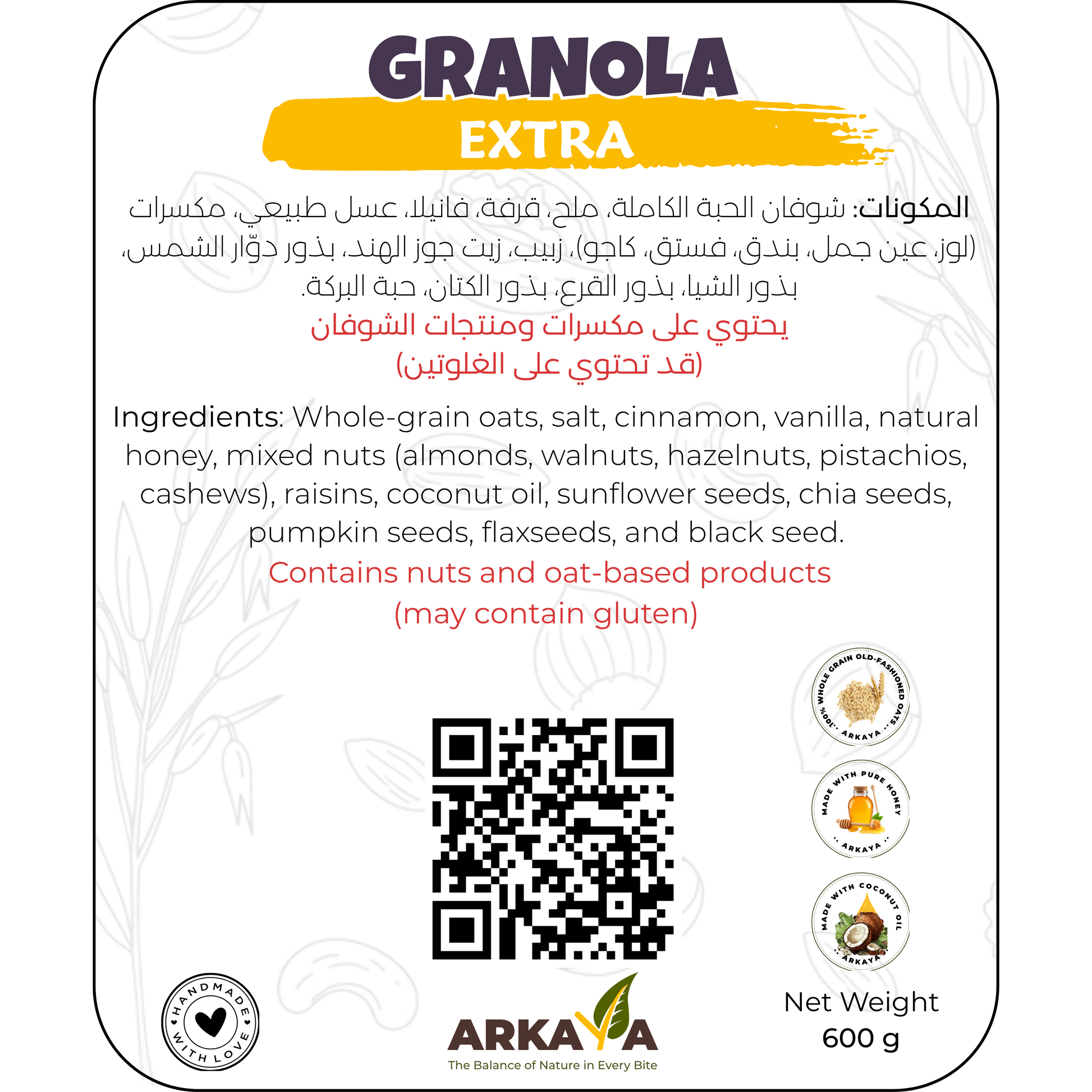 شوفان محمص، مكسرات متنوعة (لوز، عين جمل، بندق، فستق، كاجو)، عسل طبيعي، زيت جوز الهند، بذور دوّار الشمس، بذور الشيا، بذور اليقطين، بذور الكتان، بذور السمسم، ولمسة خفيفة من القرفة.